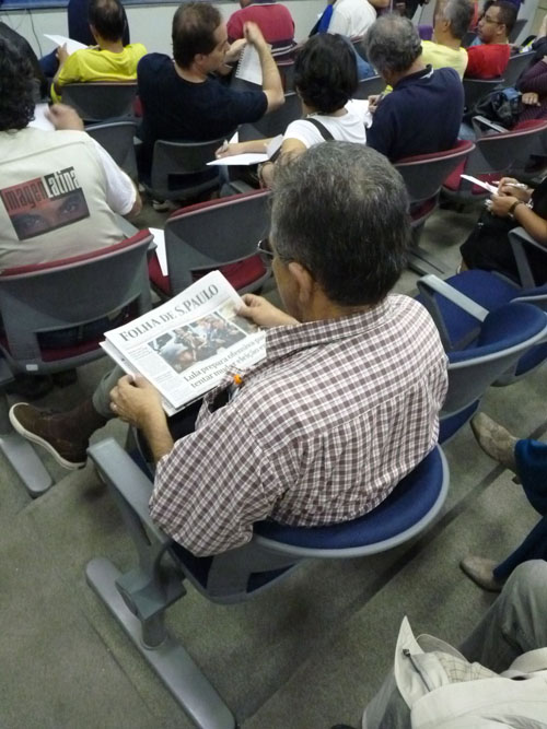 Nem sempre houve espaço no auditório para os participantes; à esquerda, Marco Aurélio Mello, do Doladodelá.